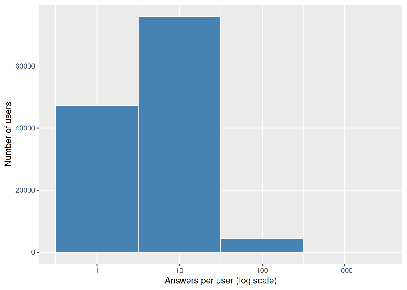 - The histogram shows that most users gave fewer than 10 answers, with a long tail of power users.