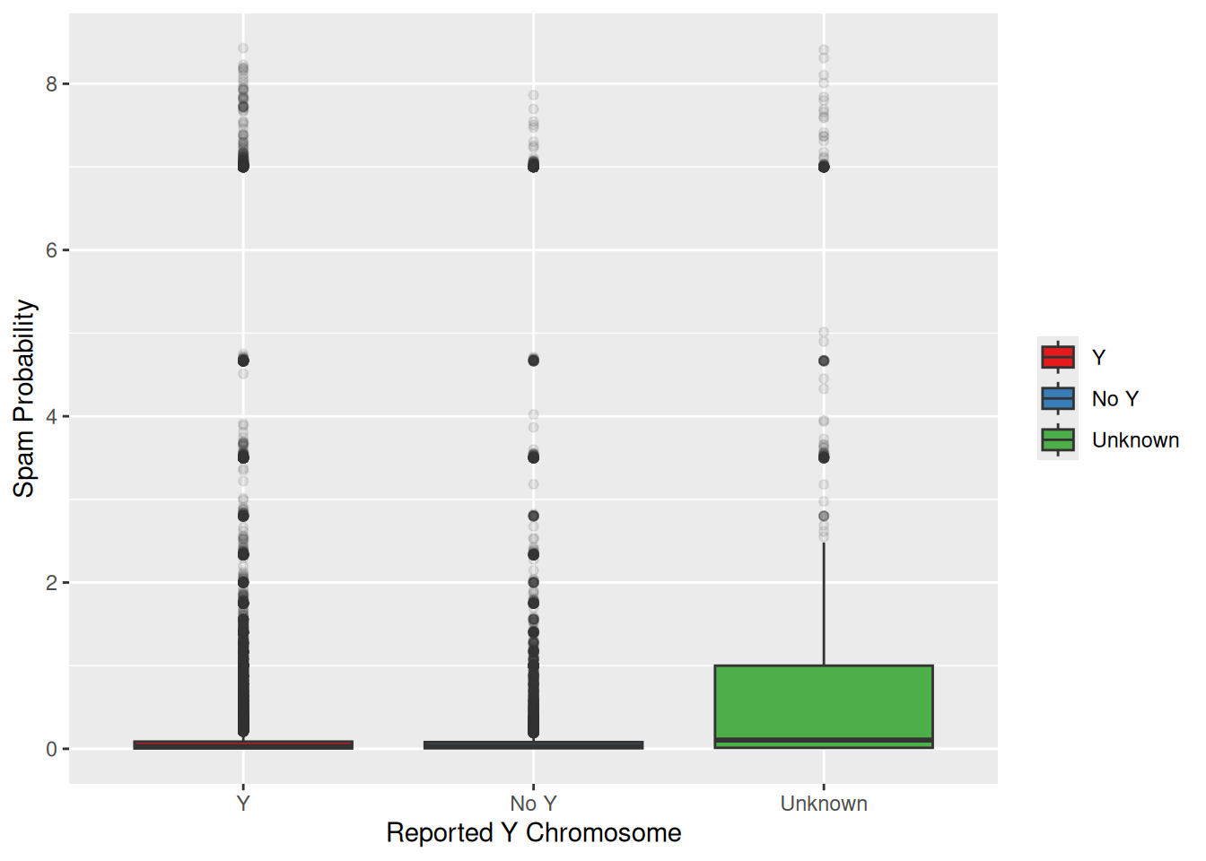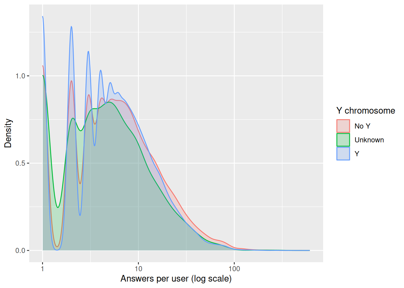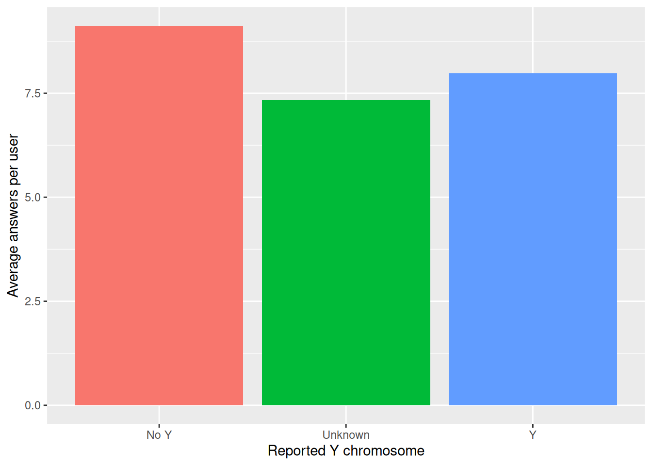 - On average, answer counts per user are fairly similar across Y chromosome groups.